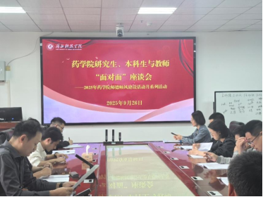 (通讯员:曾祥聪 审核人:陈清杰) 9月26日上午,药学院召开2025年师德师风建设活动月师生座谈会。药学院领导、教学办主任、学工办主任、专业负责人、以及10余名教师代表参会,与40余名本科生研究生代表面对面交流,研究生处副处长张志鹏应邀参会,会议由副院长陈清杰主持。