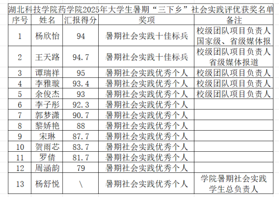 共青团湖北科技学院委员会关于2025年大学生暑期“三下乡”社会实践评优通知,经学生个人申请参与药学院9月4日“青春赴山海,实践绘蓝图”社会实践汇报、学院复审,现将获奖名单奖项予以公示: